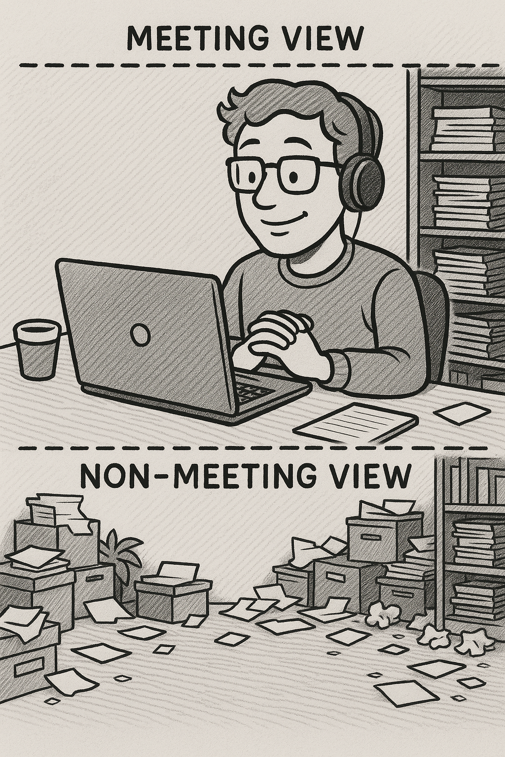 But what about the "non-meeting view" - that organizational disaster zone lurking just outside the frame? The towering paper stacks, overflowing boxes, scattered documents, and forgotten coffee cups that represent your actual workspace reality?
